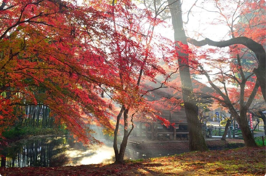 秋季時分,溫泉街周圍的山林披上紅黃色彩,與古色古香的建築相映成趣,彷彿走入時光隧道。漫步在石板路上,感受大正浪漫的溫泉鄉風情,品嚐當地特色小吃,享受悠閒的午後時光。