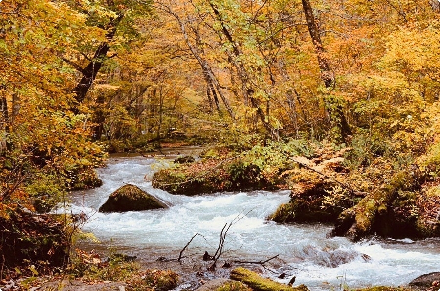 健行步道沿著溪流鋪設,路面平緩好走,全程約需3至4小時,適合各年齡層遊客悠閒漫步。沿途設有多處觀景台與休憩點,可隨時停下腳步欣賞美景、拍照留念。漫步在原始林間,呼吸清新空氣,聆聽潺潺水聲與鳥鳴蟲叫,感受大自然的寧靜與生命力。溪水清澈見底,水質純淨,據說飲用還能帶來好運。奧入瀨溪一年四季皆美,但秋季紅葉時節最為驚艷,是攝影愛好者與健行者的天堂,也是日本必訪的絕景之一。