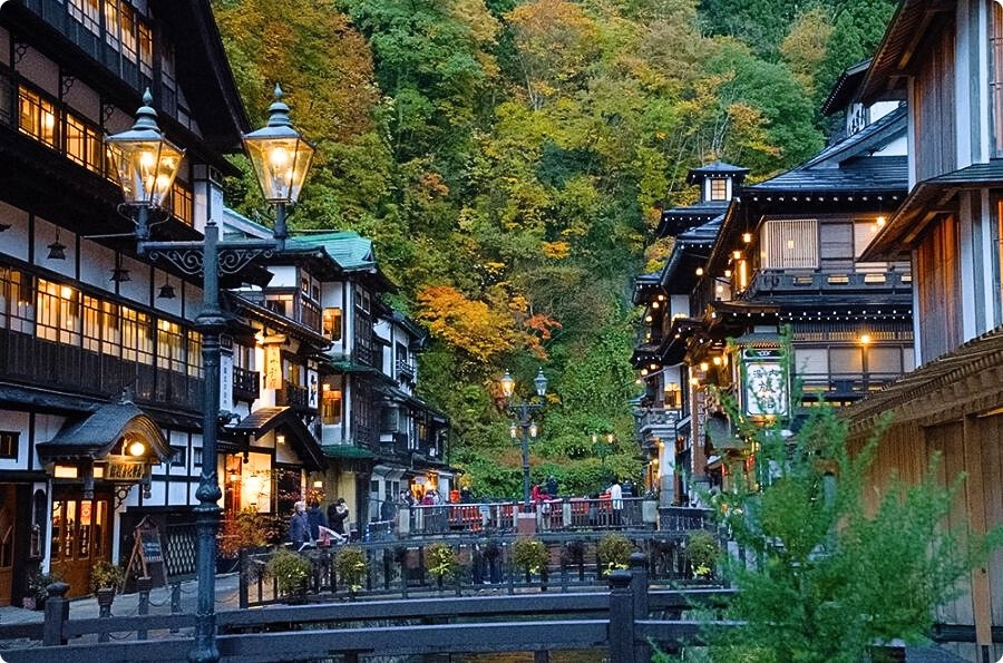 夜晚時分,街道點起復古的瓦斯燈,燈光映照在溪流上,營造出夢幻的氛圍,宛如走入時光隧道。這裡是日本知名動畫《神隱少女》中油屋場景的靈感來源之一。秋季紅葉襯托復古街景更顯詩意,冬季白雪覆蓋屋頂與街道,又是另一番絕景。銀山溫泉是山形縣最具代表性的溫泉勝地,也是體驗大正浪漫氛圍的最佳場所。