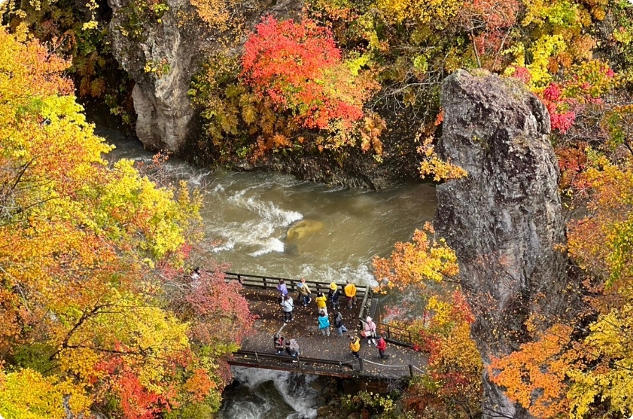 峽谷間的鳴子峽遊步道讓您可以近距離欣賞楓紅,感受秋日山林的靜謐與美麗。這裡也是東北賞楓期間最受歡迎的景點之一,每年吸引無數遊客前來朝聖。