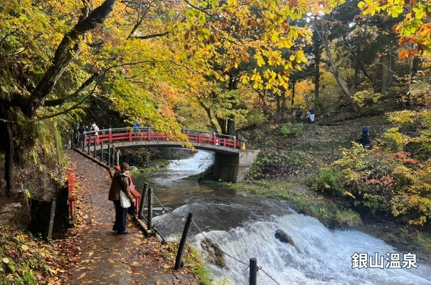 【銀山溫泉】位於山形縣尾花澤市的山間溫泉街,因江戶時代開採銀礦而得名。溫泉街保留著大正至昭和初期的木造三層、四層溫泉旅館建築,兩側建築倒映在銀山川的溪流中,懷舊氛圍濃厚。街道鋪設石板路,兩旁矗立著歷史悠久的旅館,外牆裝飾著精美的鏝繪灰泥浮雕。