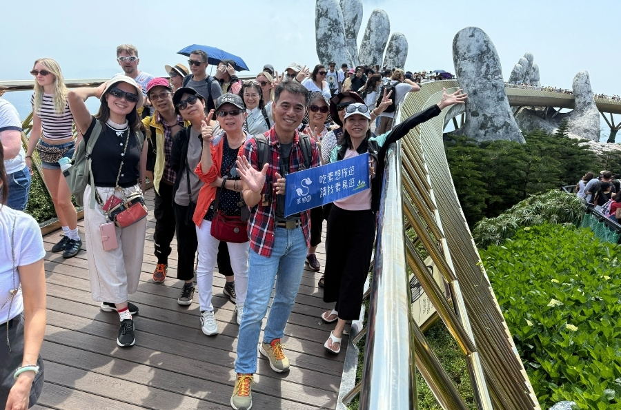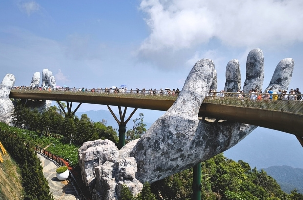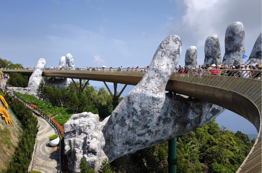 【佛手金橋天空步道】 於2018年啟用後迅速成為全球最熱門打卡景點之一。全長150公尺的金色步道由兩隻巨大石造佛手托起,彷彿神明之手將橋樑從山谷中捧出,設計震撼獨特。步道懸於雲端,遊客漫步其上可360度俯瞰蒼翠山林、雲海與峴港市景,視野遼闊壯觀。