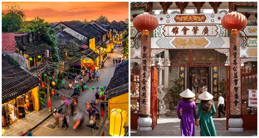 【會安古鎮】 於越南中部廣南省,距峴港約30公里,1999年列入世界文化遺產。15至19世紀曾是東南亞重要國際貿易港,中國、日本、荷蘭、法國商人雲集於此,留下多元文化交融的建築風貌。古鎮保存完整的黃色牆面木造房屋、窄巷石板路、古老會館與廟宇,其中日本橋、福建會館、陳富街等最具代表性。