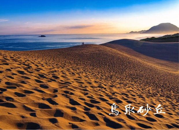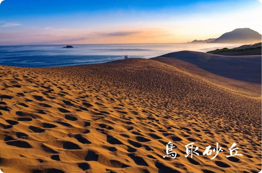 【鳥取砂丘】 位於鳥取縣鳥取市日本海沿岸,是日本最大的海岸砂丘,東西綿延約16公里,南北寬約2公里,最高處達47公尺。歷經十萬年風蝕與海浪作用形成的自然奇景,沙丘起伏如沙漠般壯觀,被指定為天然紀念物及山陰海岸國立公園一部分。