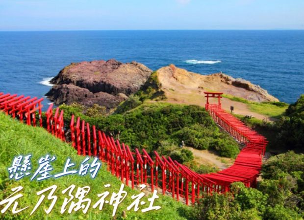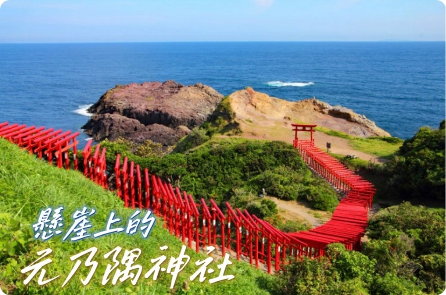 【元乃隅神社】 以123座連綿排列的朱紅色鳥居聞名,綿延約100公尺直通日本海岸邊。神社建於1955年,祭祀商業繁盛、海上安全等,因CNN評選為「日本最美景點31選」而聲名大噪。鳥居隧道蜿蜒於山崖草地上,與蔚藍海景、白色浪花形成強烈視覺對比,景色壯麗。神社最高處的鳥居上方設有賽錢箱,高達5公尺,據說能將香油錢投入便可實現願望。