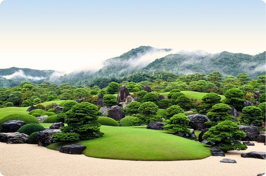 【足立美術館】 位於島根縣安來市,創立於1970年,以5萬坪日本庭園與近代日本畫收藏聞名於世。庭園連續21年獲美國日本庭園專門雜誌評選為「日本第一」,枯山水庭、白砂青松庭等六大庭園四季呈現不同風貌,宛如一幅幅立體山水畫。