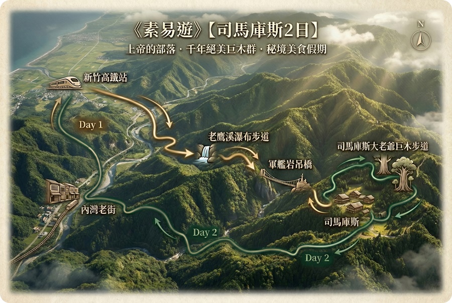 走進原始森林,與千年神木相遇;中午享用山林私廚料理,下午前往內灣老街輕鬆散步,最後返回新竹高鐵站,為二日山林之旅畫下圓滿句點。