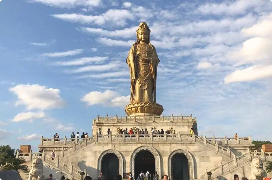 矗立於普陀山海岸,高達33公尺,面向東海莊嚴寧靜。金身在陽光與海風中閃耀,象徵觀音守護眾生的慈悲願力。站在佛前遠眺海天一色,心境也隨之沉靜開闊,是極具靈性與震撼的朝聖地。