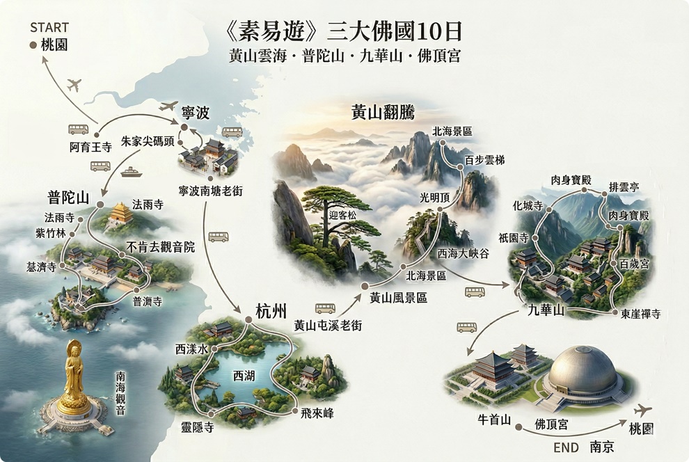 《素易遊》【三大佛國10日】黃山雲海.普陀山.九華山.佛頂宮 文化參訪|無購物