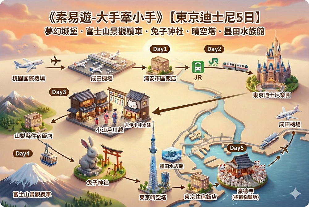 專為親子家庭量身打造的東京行程,結合孩子最愛的主題樂園與水族館,以及大人喜歡的日式文化與輕鬆散策景點。行程安排寬鬆不緊湊,讓孩子盡情玩樂、家長安心陪伴,留下最珍貴的親子回憶。