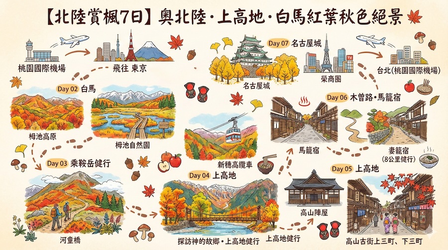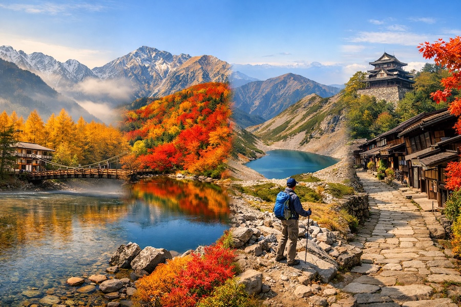 加上最親近、最好走的百名山——乘鞍岳,以及鋪滿古意與歷史氣息的木曾路。