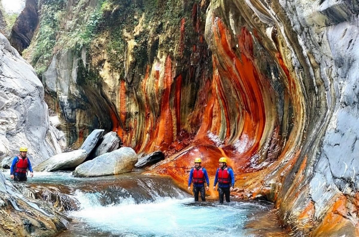 位於屏東霧台鄉的哈尤溪,以陽光照耀下閃爍七彩光澤的岩壁聞名。岩層因礦物質沉積與歲月沖蝕,呈現出紅、橙、黃、綠、藍、紫的斑斕色彩,宛如大自然的油畫。沿著碧綠溪流溯溪前行,奇岩峽谷、清澈水潭與光影變幻交織成壯麗畫面,是南台灣最具代表性的秘境之一,也被旅人譽為「上帝打翻調色盤的地方」。