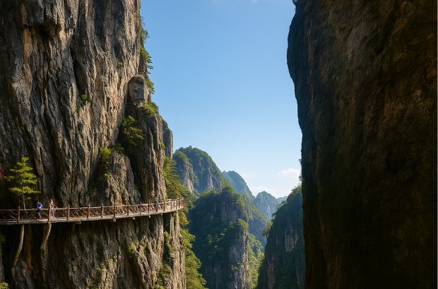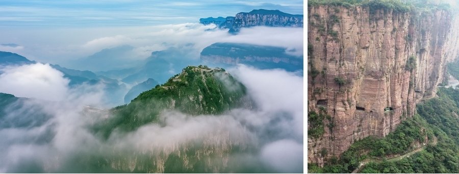 位於河南新鄉的天界山,以驚險壯麗的「懸崖天路」聞名,蜿蜒於峭壁之上的盤山公路宛如直通天際,因此得名「天界」。山谷深切、雲霧繚繞,置身其間彷彿行走在雲端。紅岩絕壁、層巒疊嶂與高空觀景台交織成震撼景色,是感受太行山雄偉氣勢的最佳地點,也是探訪自然鬼斧神工的經典之境。
