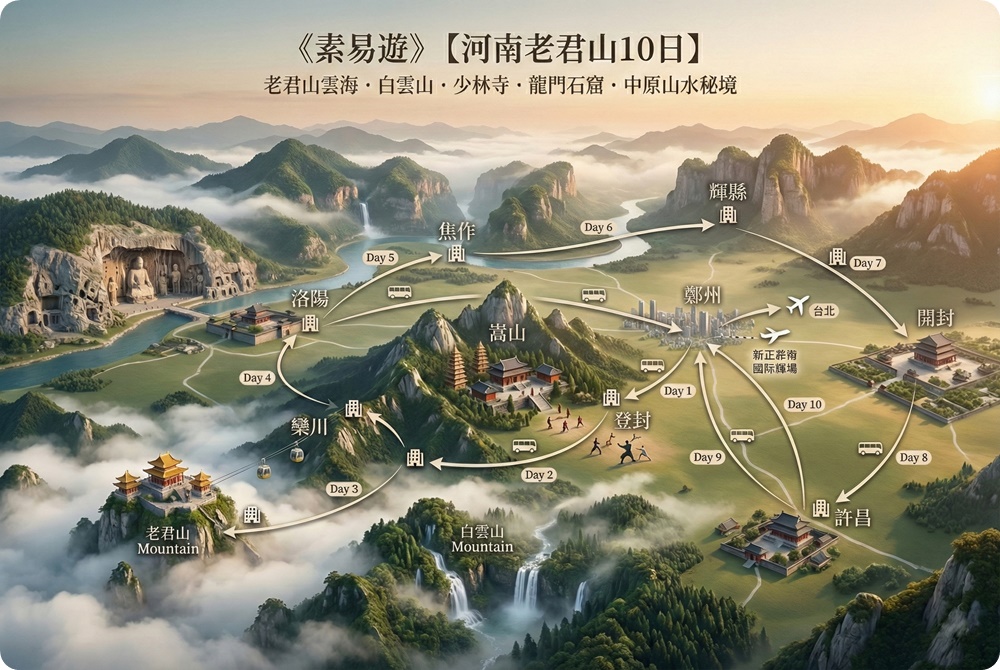 10 天旅程從佛教聖地少林寺、道教名山老君山,到世界級石窟藝術龍門石窟,再一路走入雲台山、天界山的峽谷奇景。